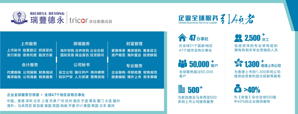 瑞豐德永(Richful Deyong)2008年始創(chuàng)于香港,系卓佳(Tricor)集團(tuán)成員,是亞洲具有領(lǐng)先地位的專業(yè)服務(wù)機(jī)構(gòu)。在全球21個(gè)國(guó)家/地區(qū)47個(gè)城市設(shè)有辦事處,擁有2500多名員工,服務(wù)超過50000多客戶,1300間香港聯(lián)交所上市公司,500間新加坡和馬來西亞上市公司,名列財(cái)富雜志500強(qiáng)企業(yè)超40%及眾多跨國(guó)知名公司。