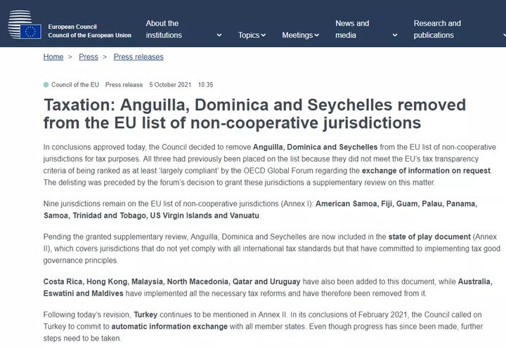 10月5日,歐盟公布了2021年的第二份“稅務不合作司法管轄區名單”(EU list of non-cooperative jurisdictions for tax purposes,即“黑名單”),宣布將安圭拉、多米尼加和塞舌爾從歐盟不合作名單中刪除。