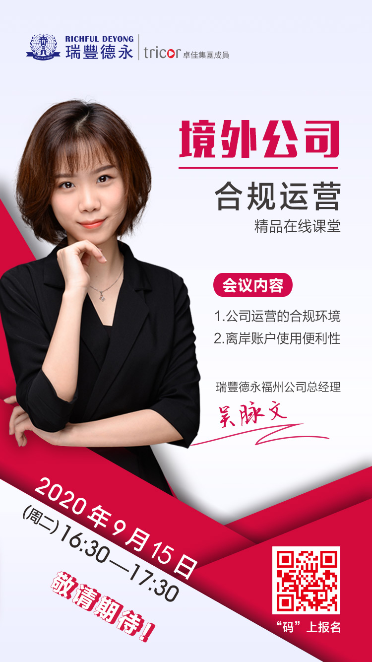 為了更好地引導(dǎo)企業(yè)規(guī)范海外經(jīng)營合規(guī)管理工作,提高企業(yè)國際競爭力,推動(dòng)企業(yè)持續(xù)提升合規(guī)管理水平,9月15日,瑞豐德永特別安排「境外公司合規(guī)運(yùn)營」線上研討會,在此我們特別邀請您參與一同探討。